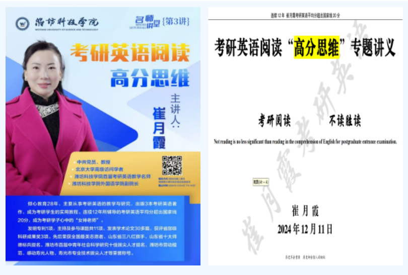希望所有考研员工以此次讲座为契机,巩固、消化和灵活运用崔月霞教授所讲的“考研英语阅读高分思维”秘籍,提高阅读速度和选项的正确率,为考研英语成绩锦上添花。
